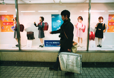 毛布を持って京都の町を歩くタイゾウ氏(写真上)。