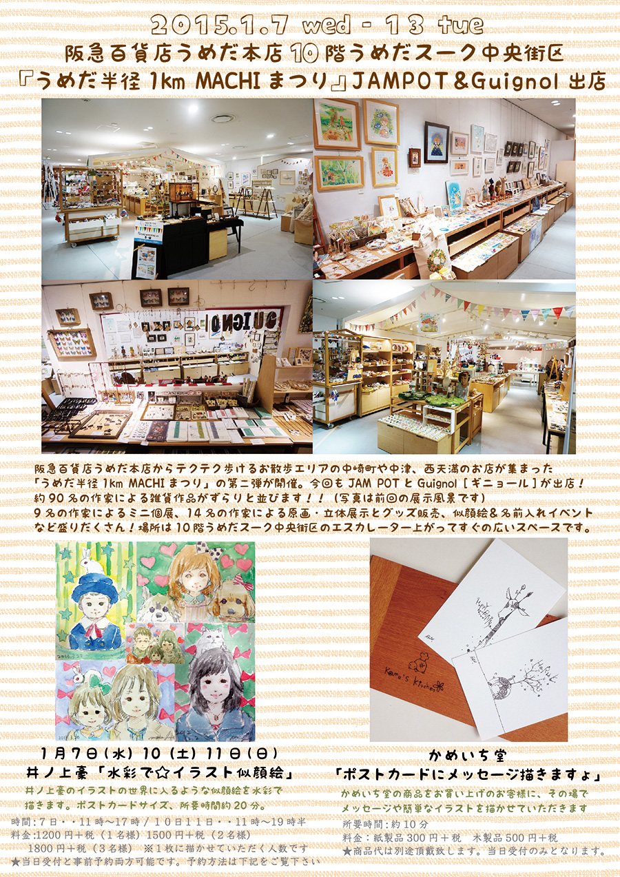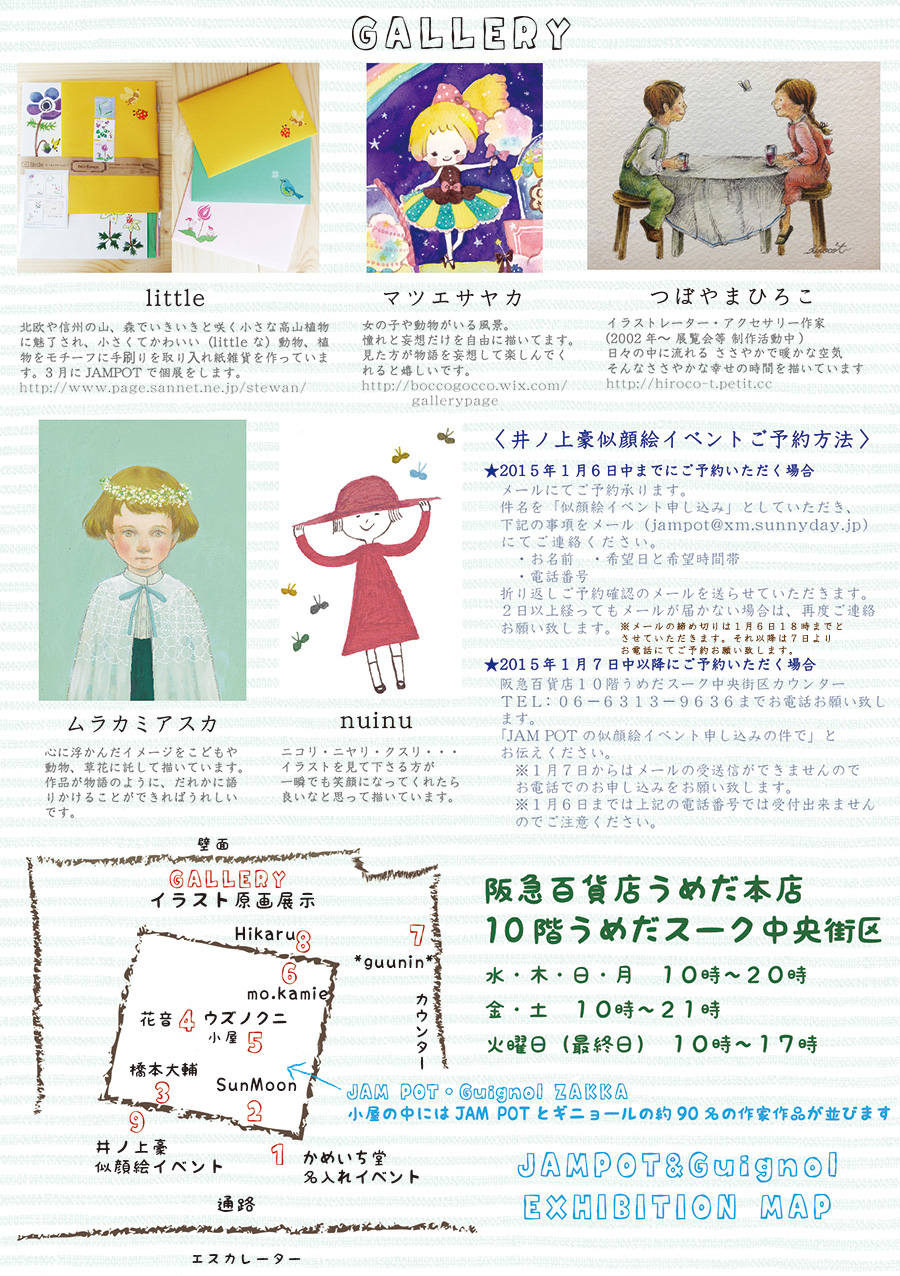 | 1月8日(木) | 橋本大輔(10時〜19時45分)、中野夕衣(10時〜20時) NAMAKEMONONO(14時〜18時)、花音(14時〜19時)、かめいち堂(10時〜20時) |