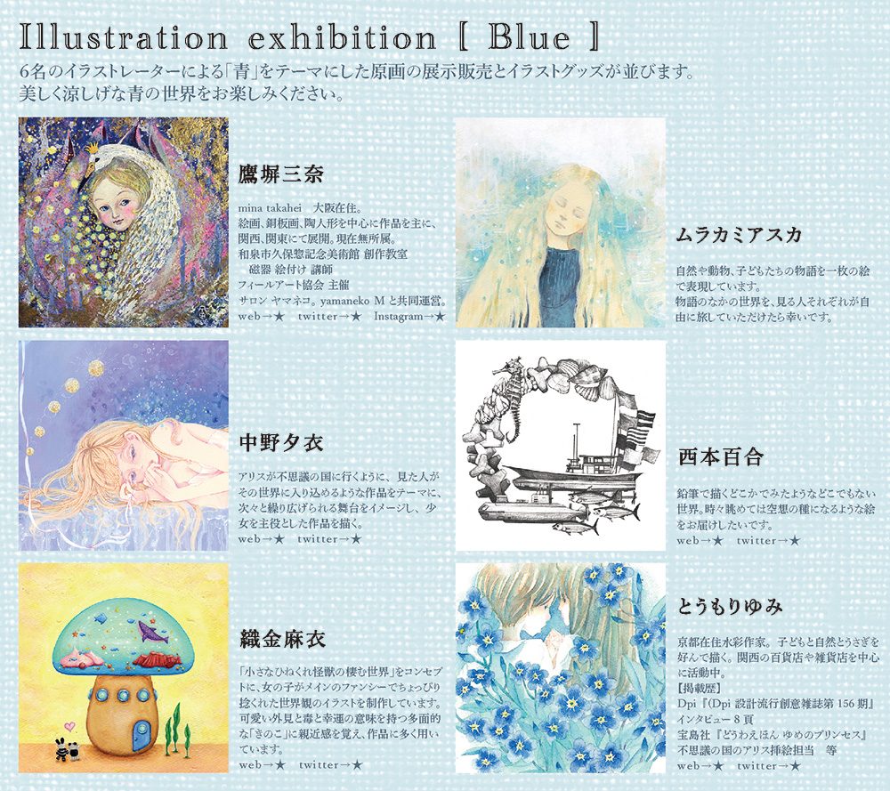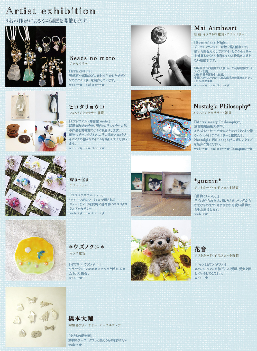 | アオキカナエ web twitter | 中野夕衣 web twitter | atelier nosumosu web | kirakira*supica web twitter | noriko factory web twitter |