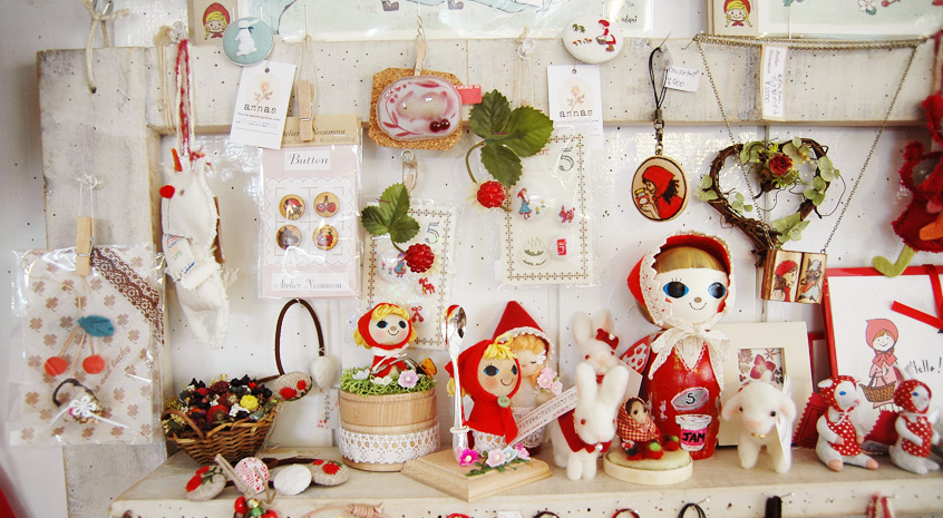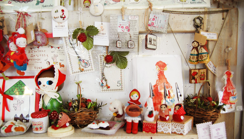 赤ずきんや動物たちのお人形やストラップ・アクセサリーが並んでいます。細かい作品が多いので、近寄ってみてみましょう。