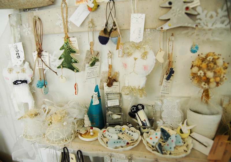 陶器のツリーのオーナメントや、猫と鳥のアクセサリー、雪だるまのブローチ、ドライフラワーのオブジェ、刺繍のヘアピンなど。