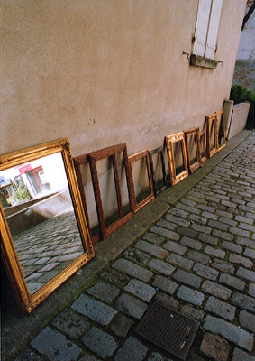 額縁が並ぶ中、1枚だけ鏡。不思議。