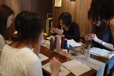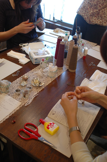 ではここでcotylifereさんの「紅茶染めレースのアクセサリーと糸巻き教室」の教室風景を・・。