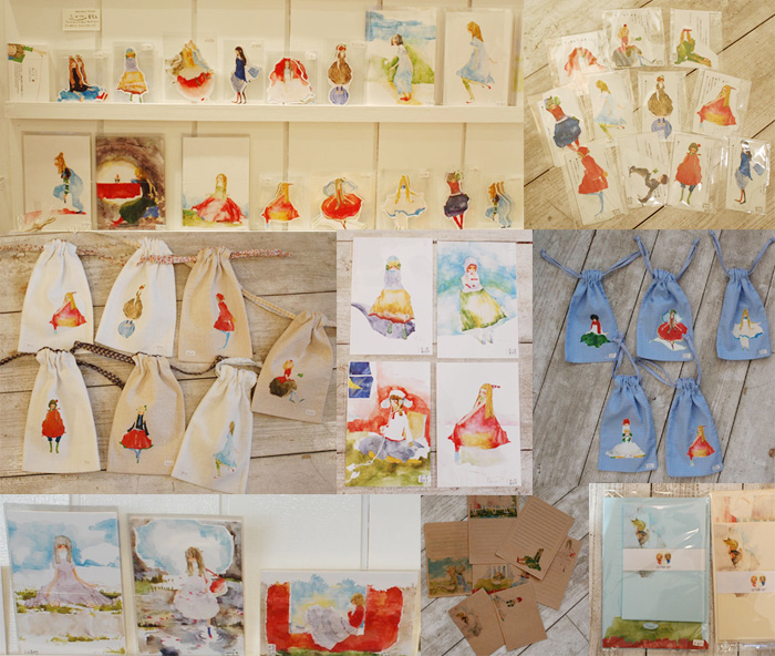 自作の水彩画イラストをモチーフにポストカード、シール、巾着袋などを制作してます。